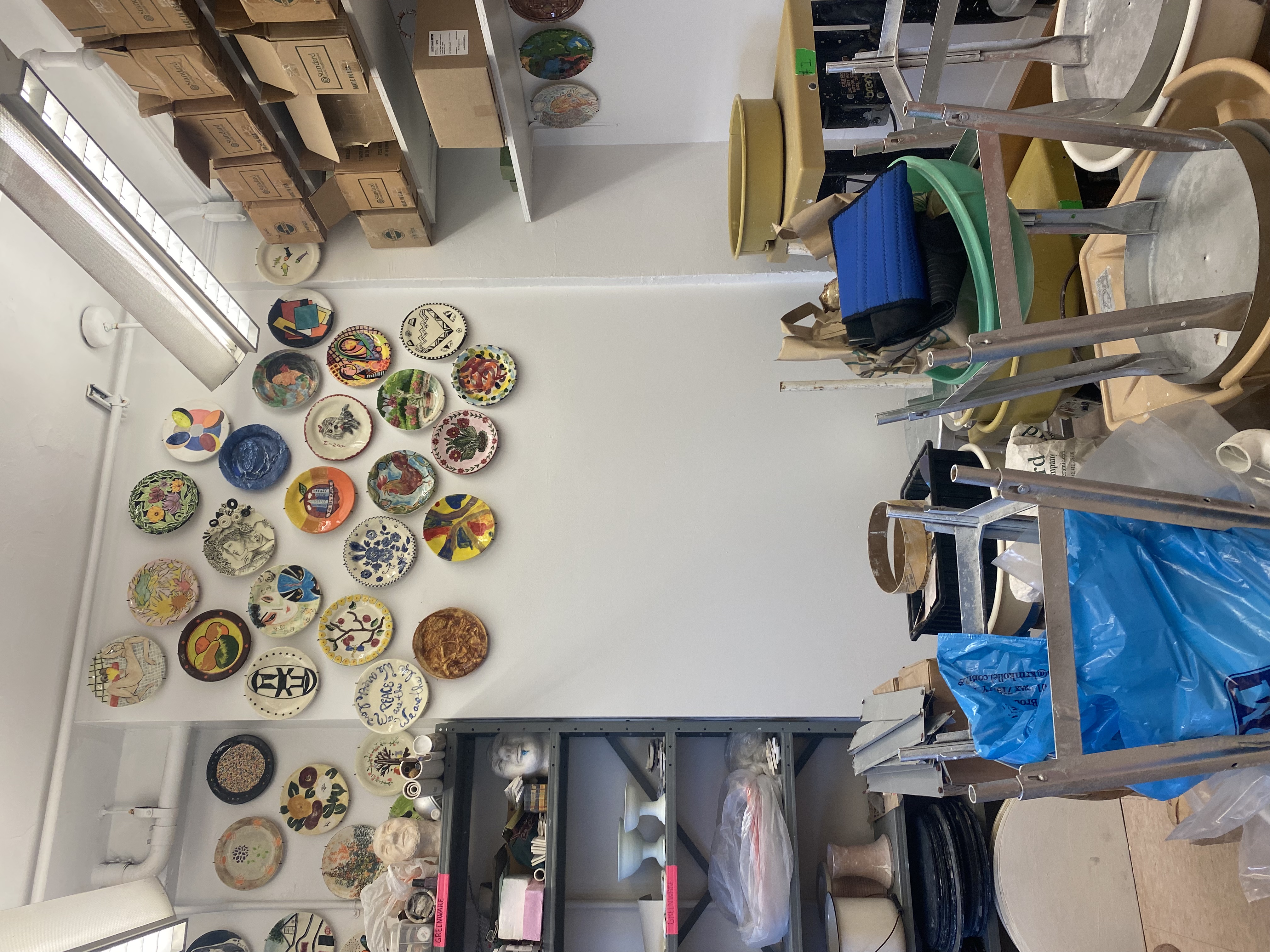 These three pieces on the top shelf were finished shortly before the city went on lockdown, and the seniors have not been back to pick them up yet. (Broke my heart! I hope they are okay and return to class soon.)